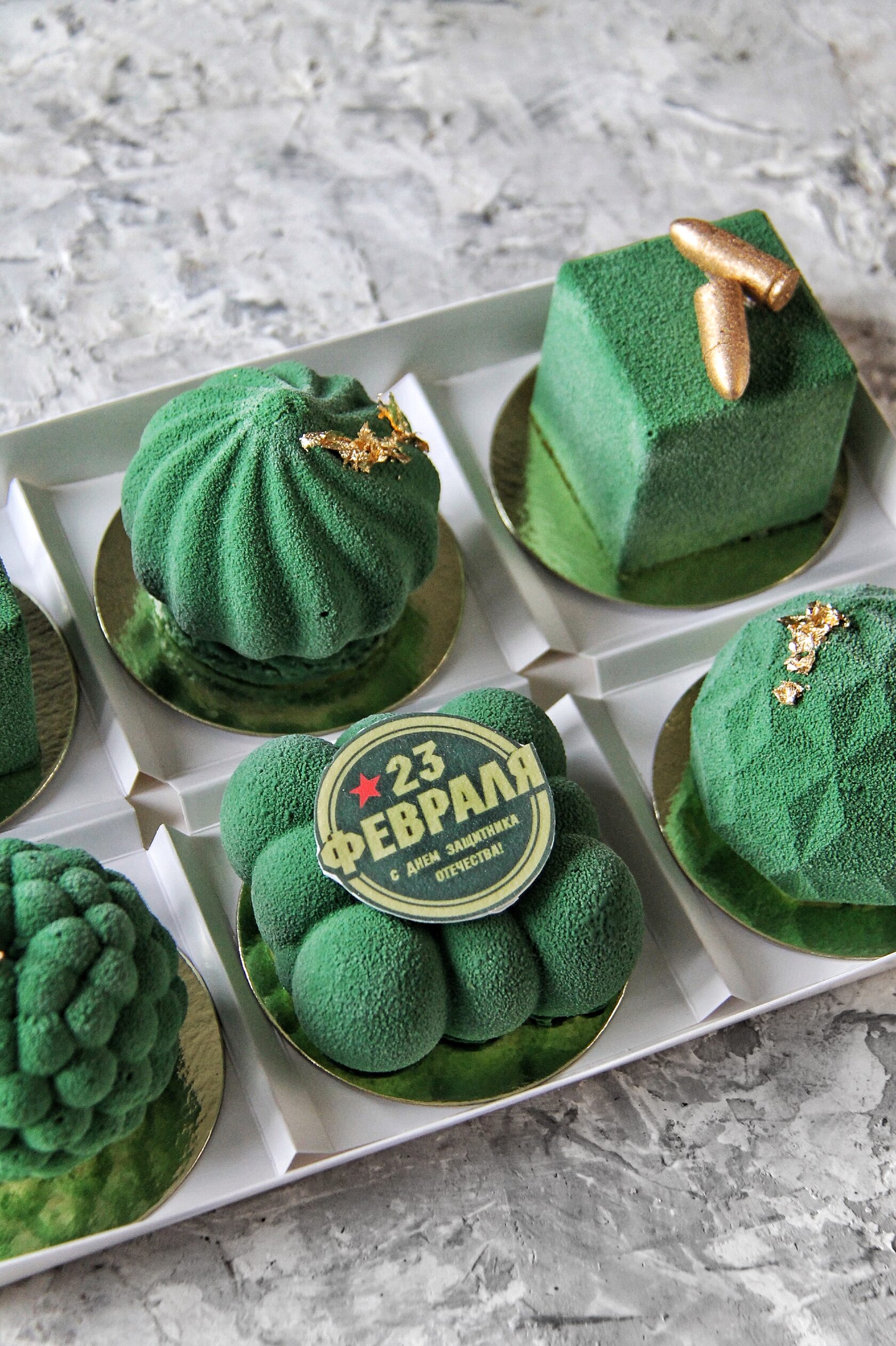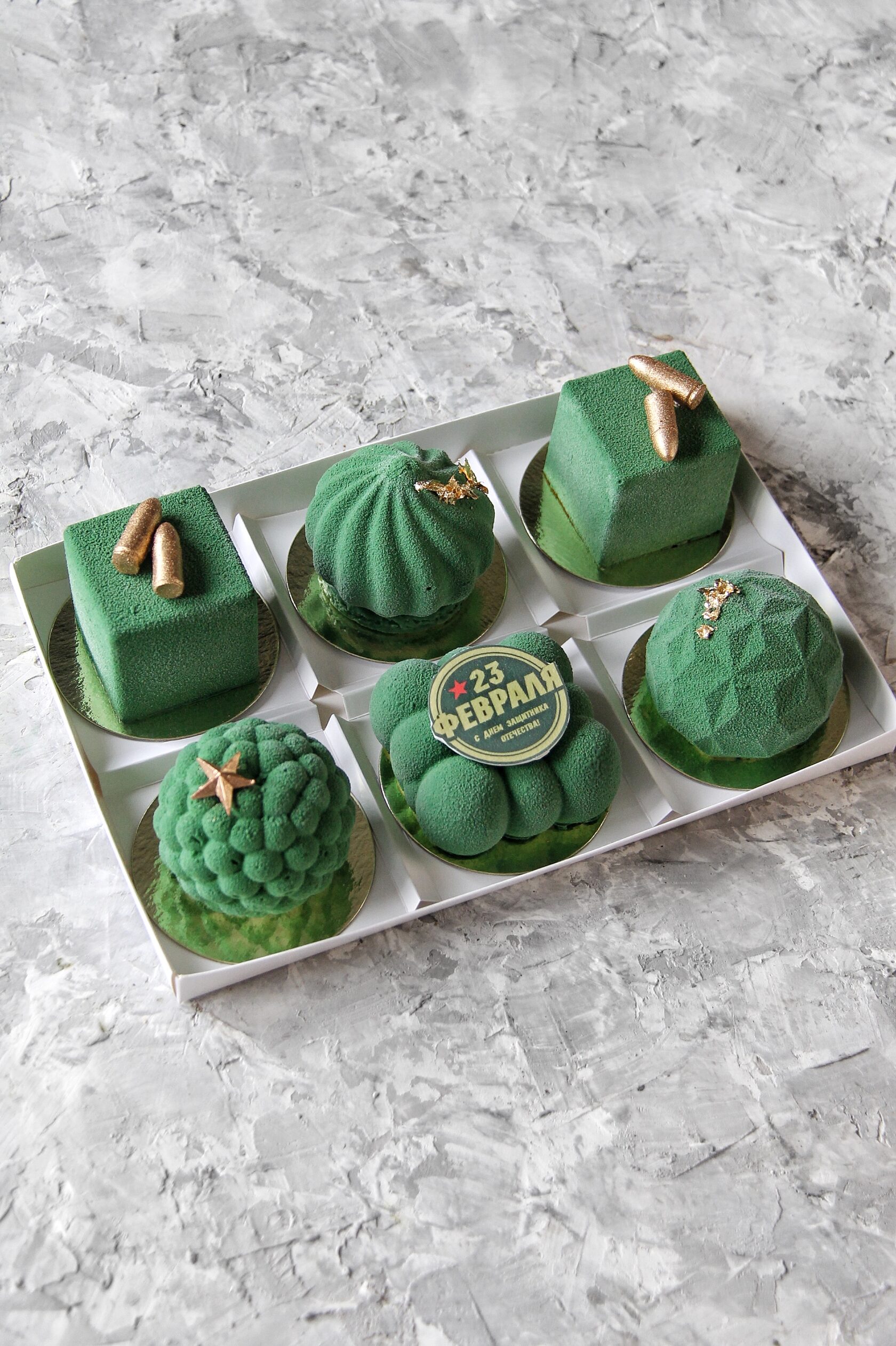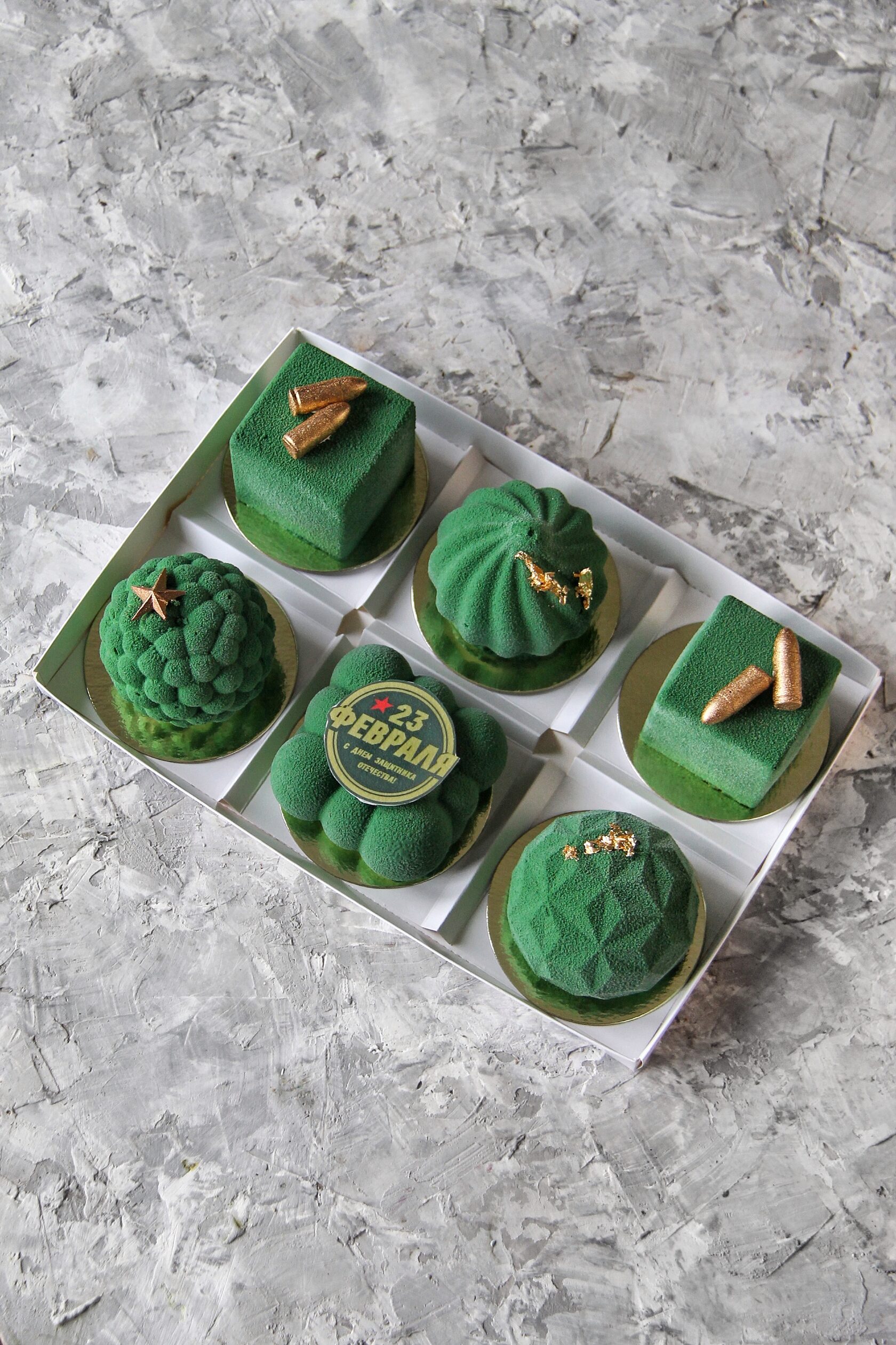 В наборе 6 муссовых пирожных ассорти с праздничным декором