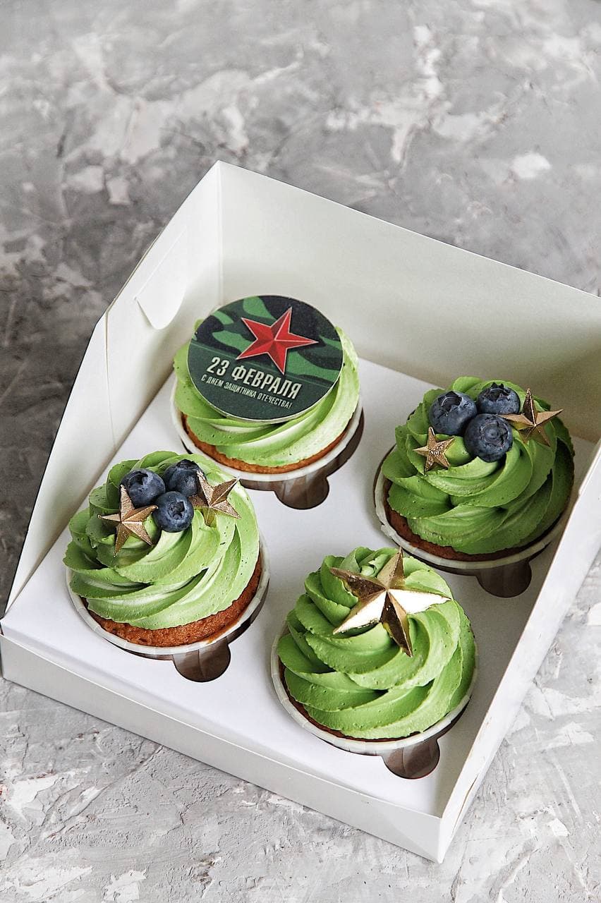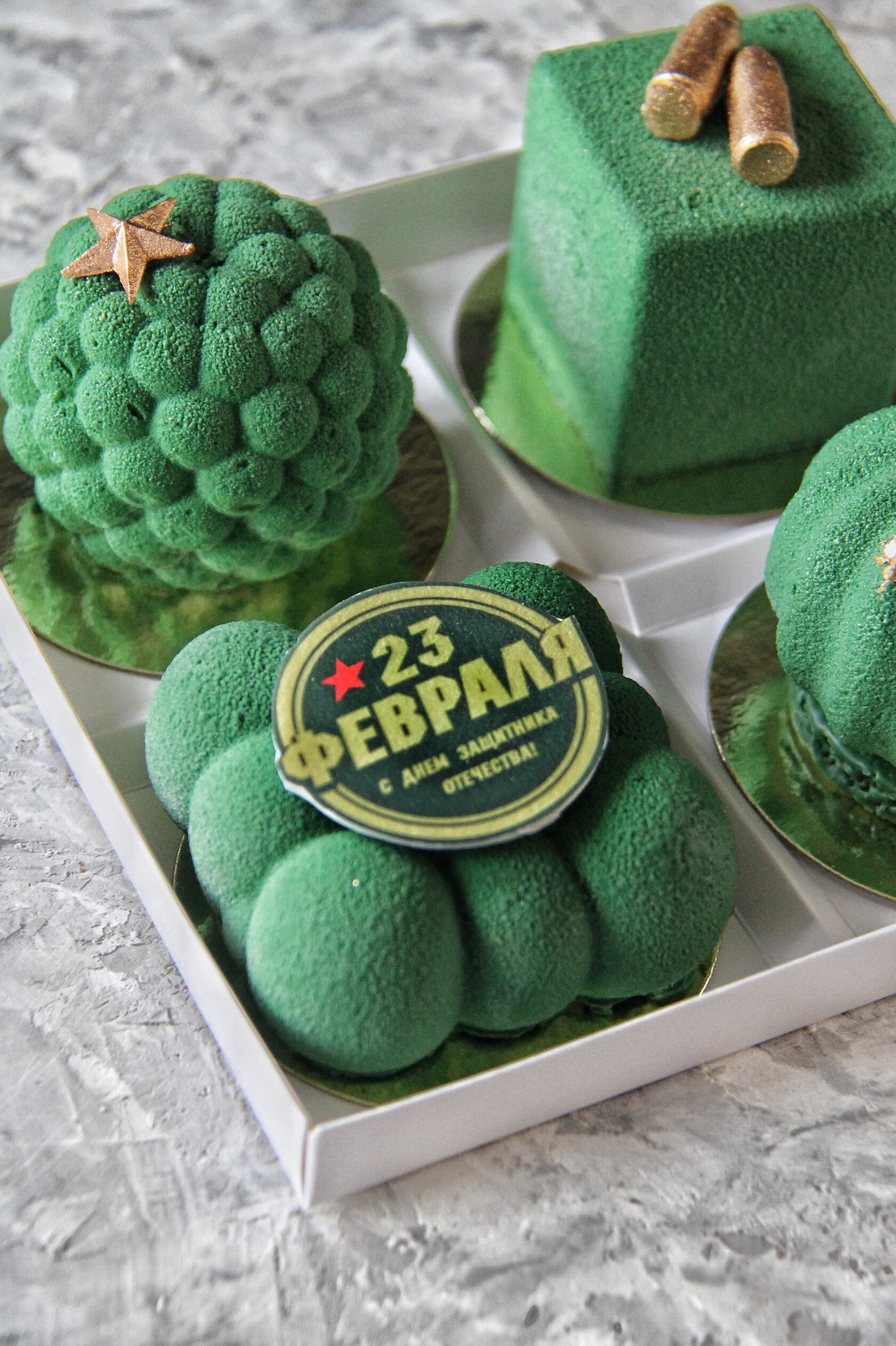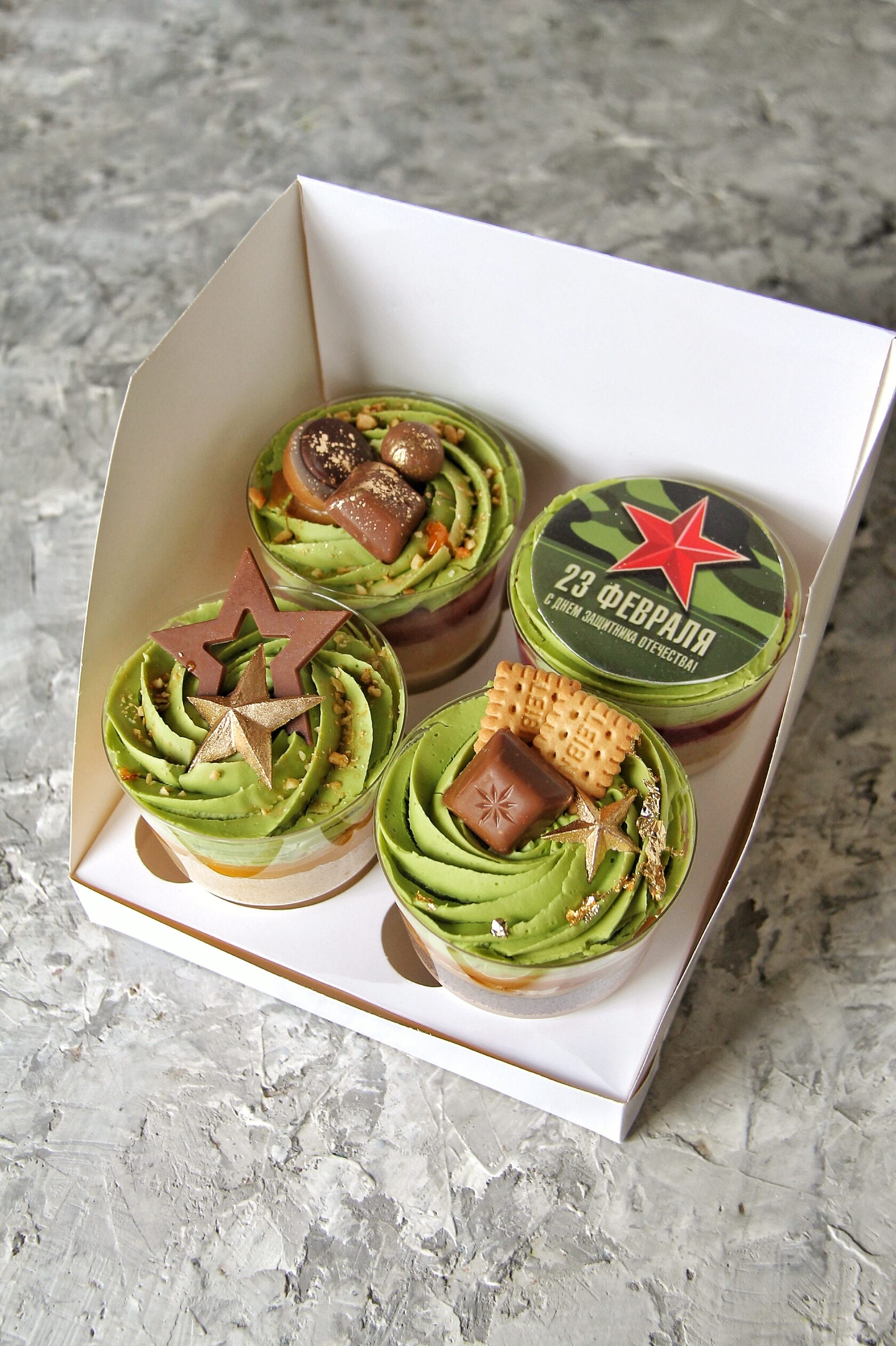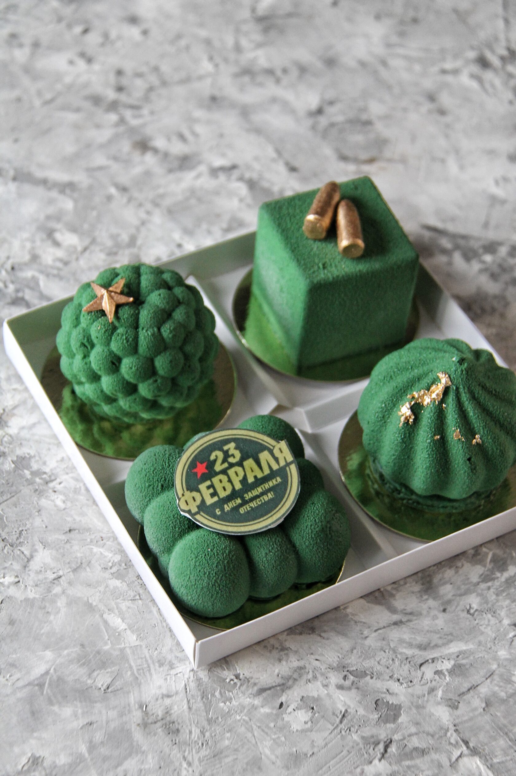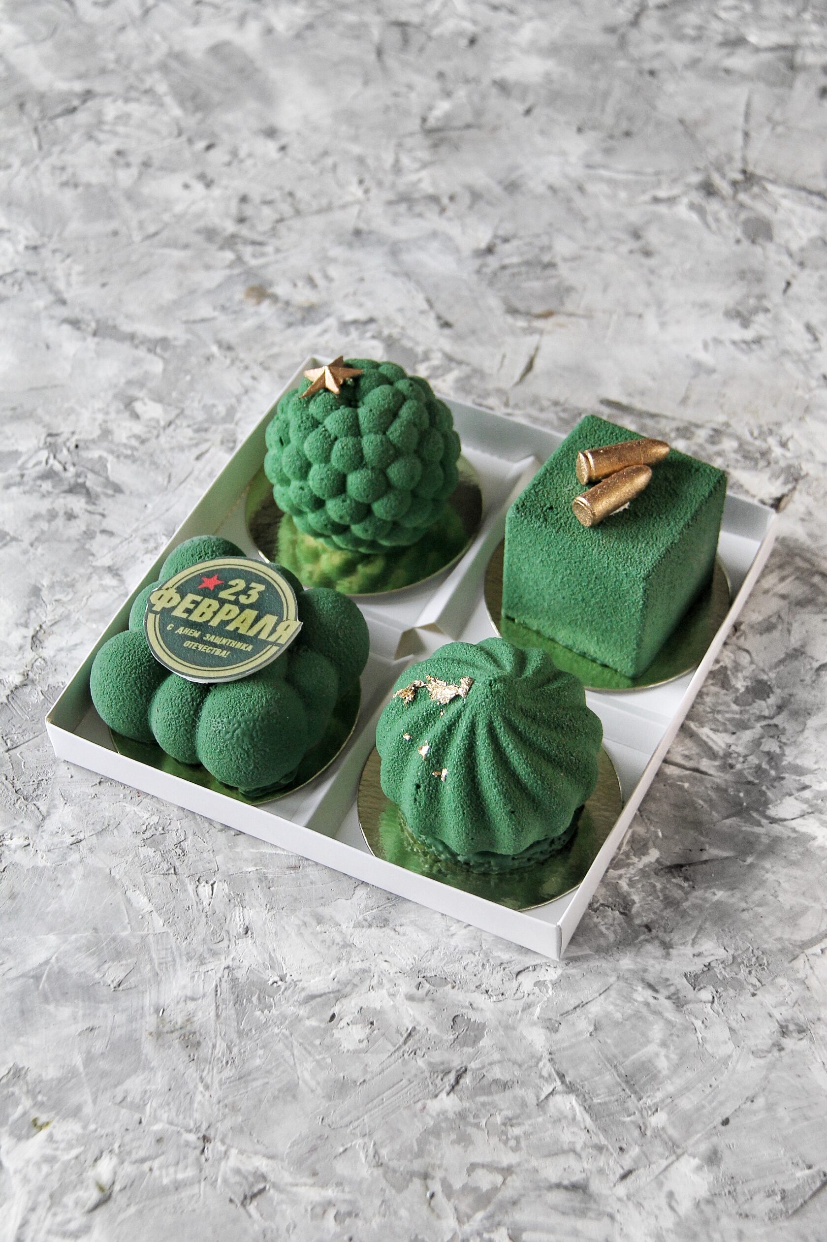 В наборе 4 муссовых пирожных ассорти с праздничным декором