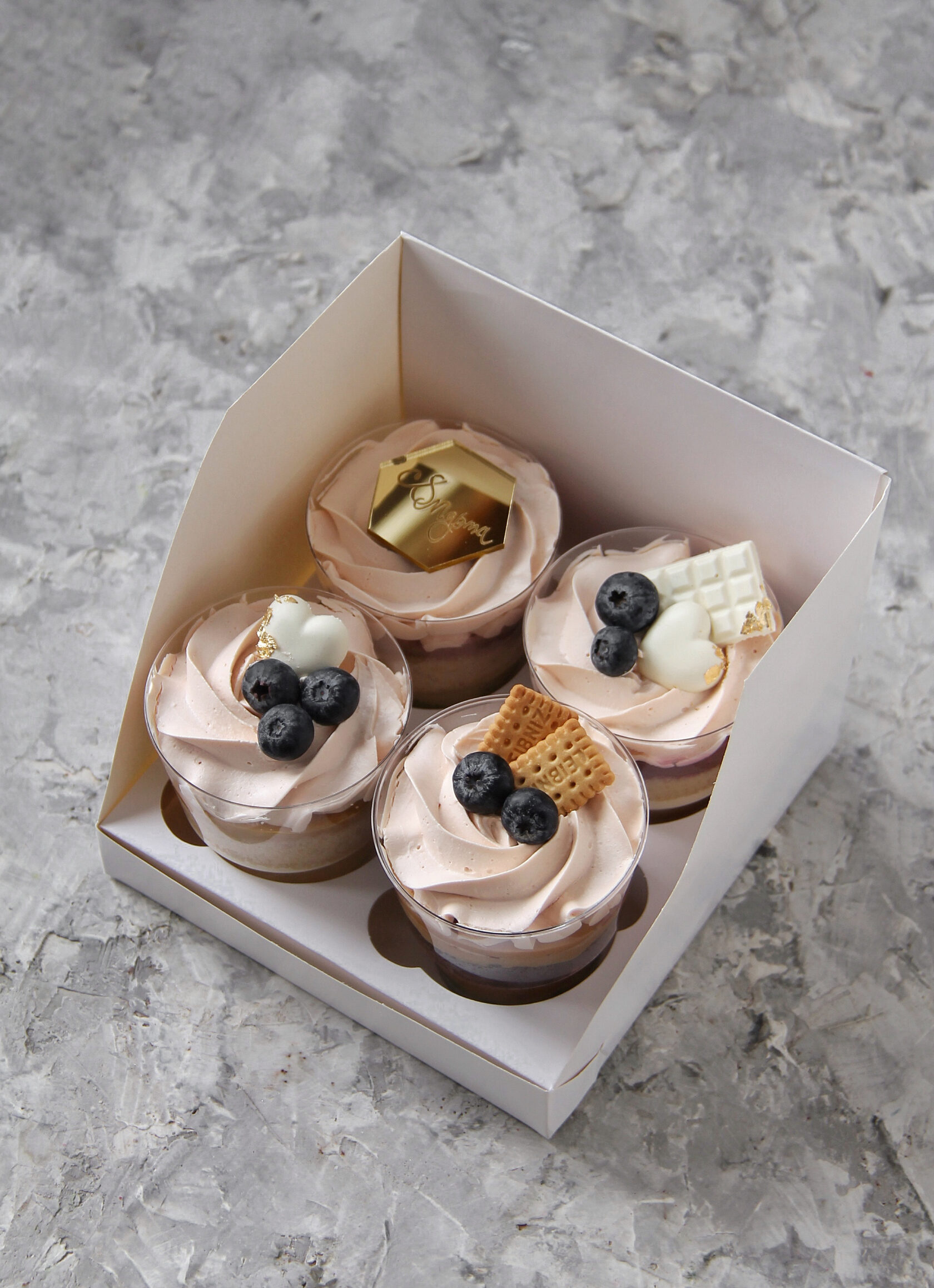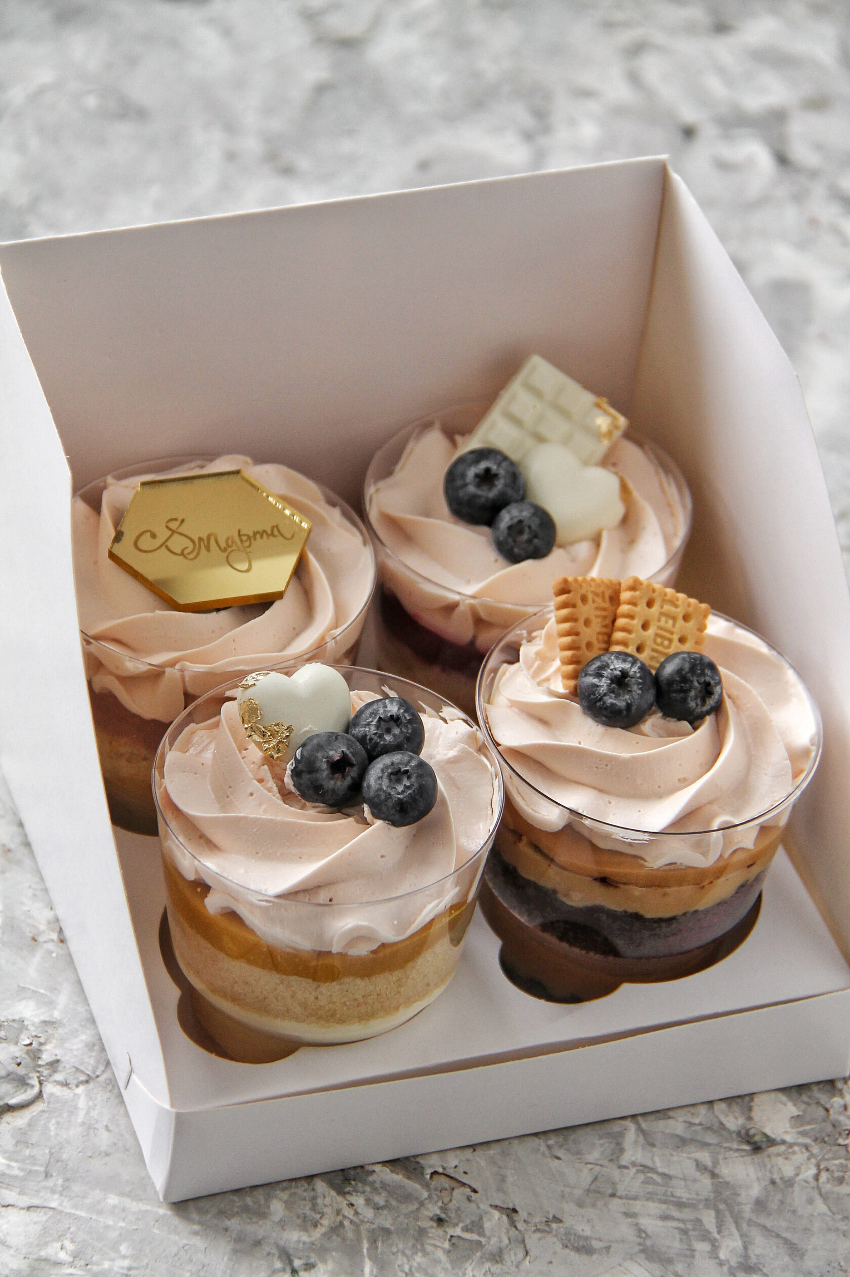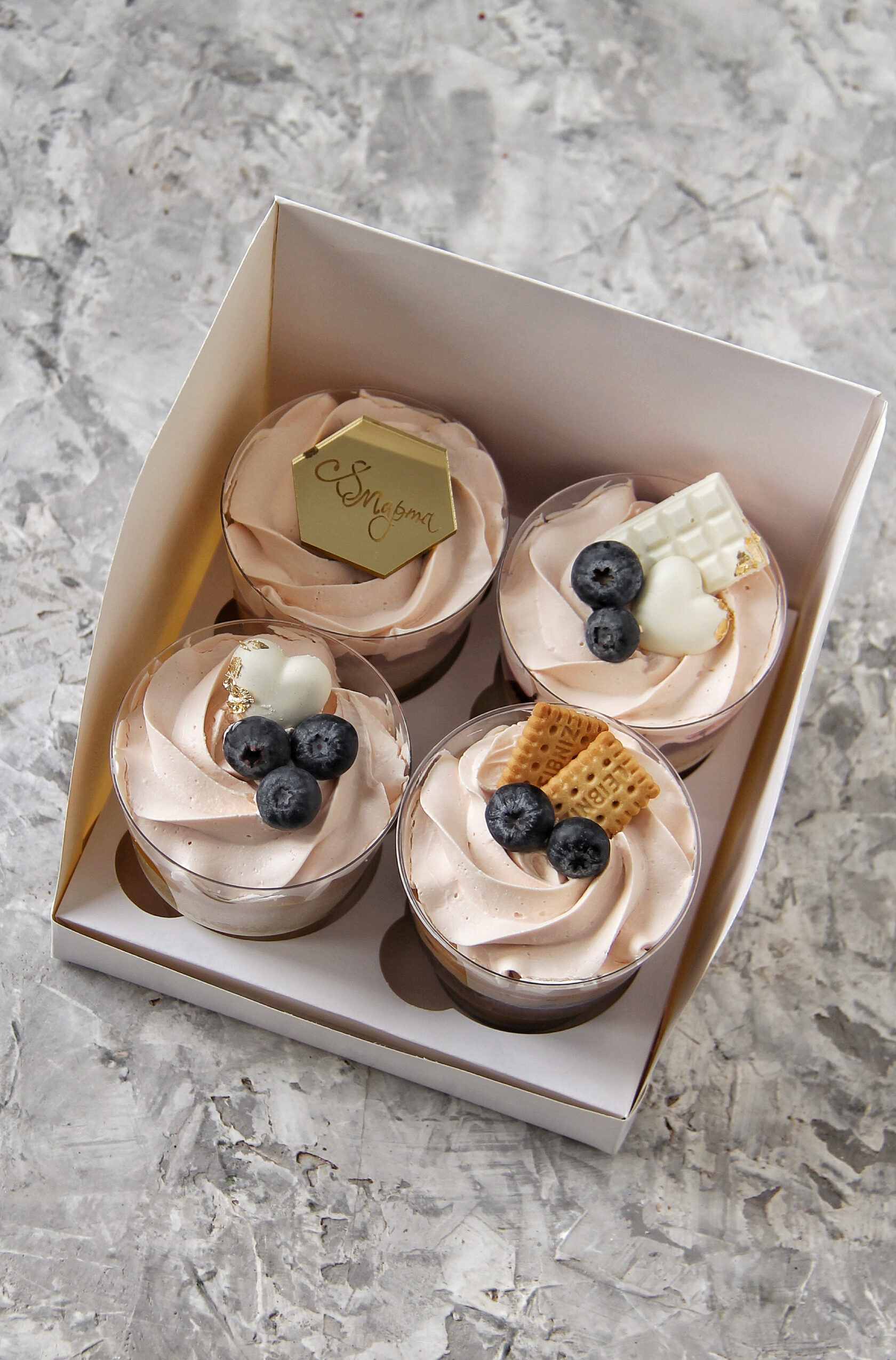Нежный десерт из крошки бисквита, сливочно-сырного крема и начинок в одноразовом пластиковом стакане. Вес каждого стакана в наборе 200-250г.