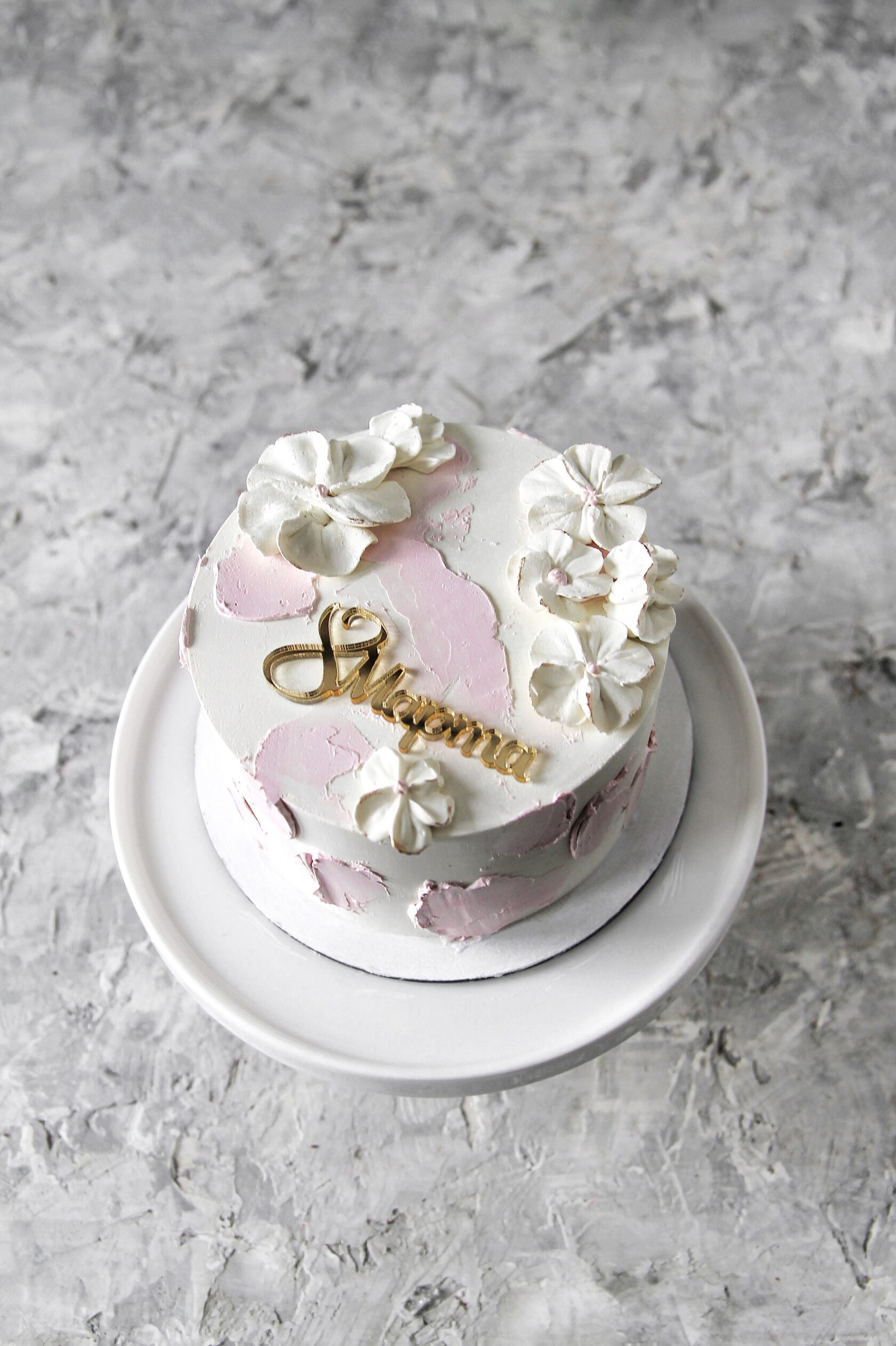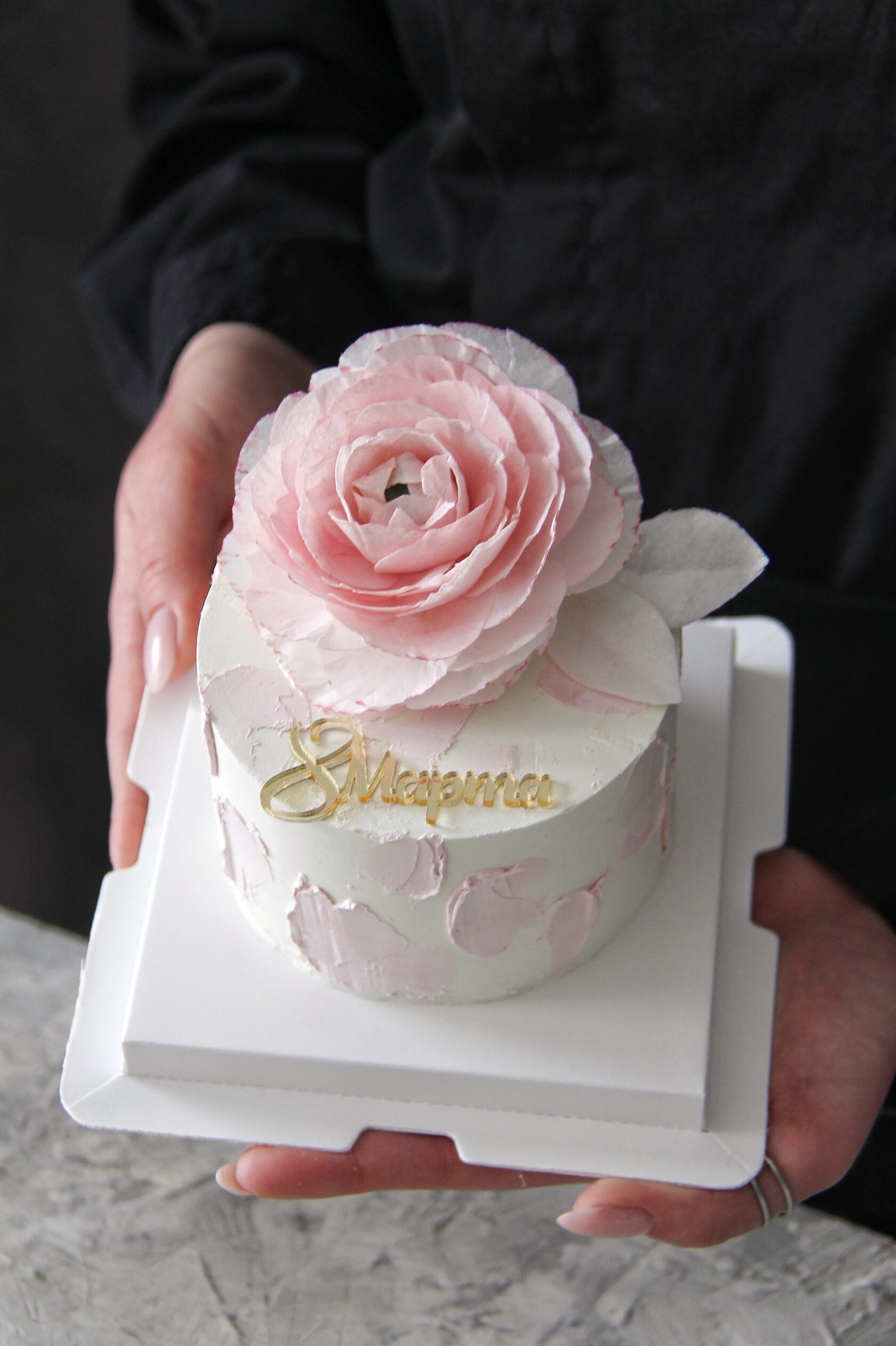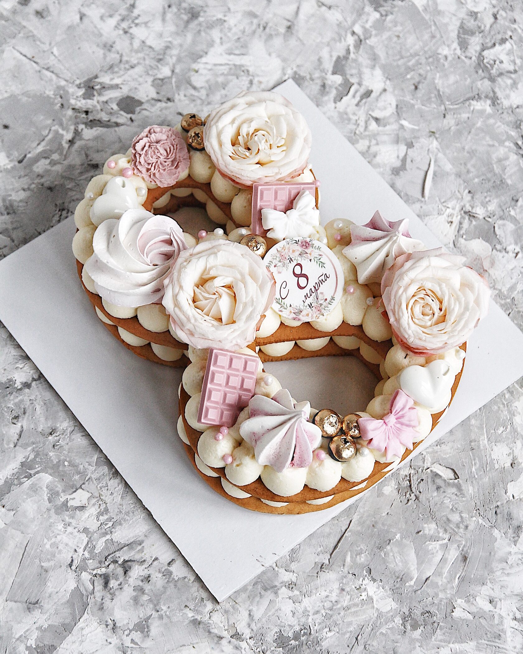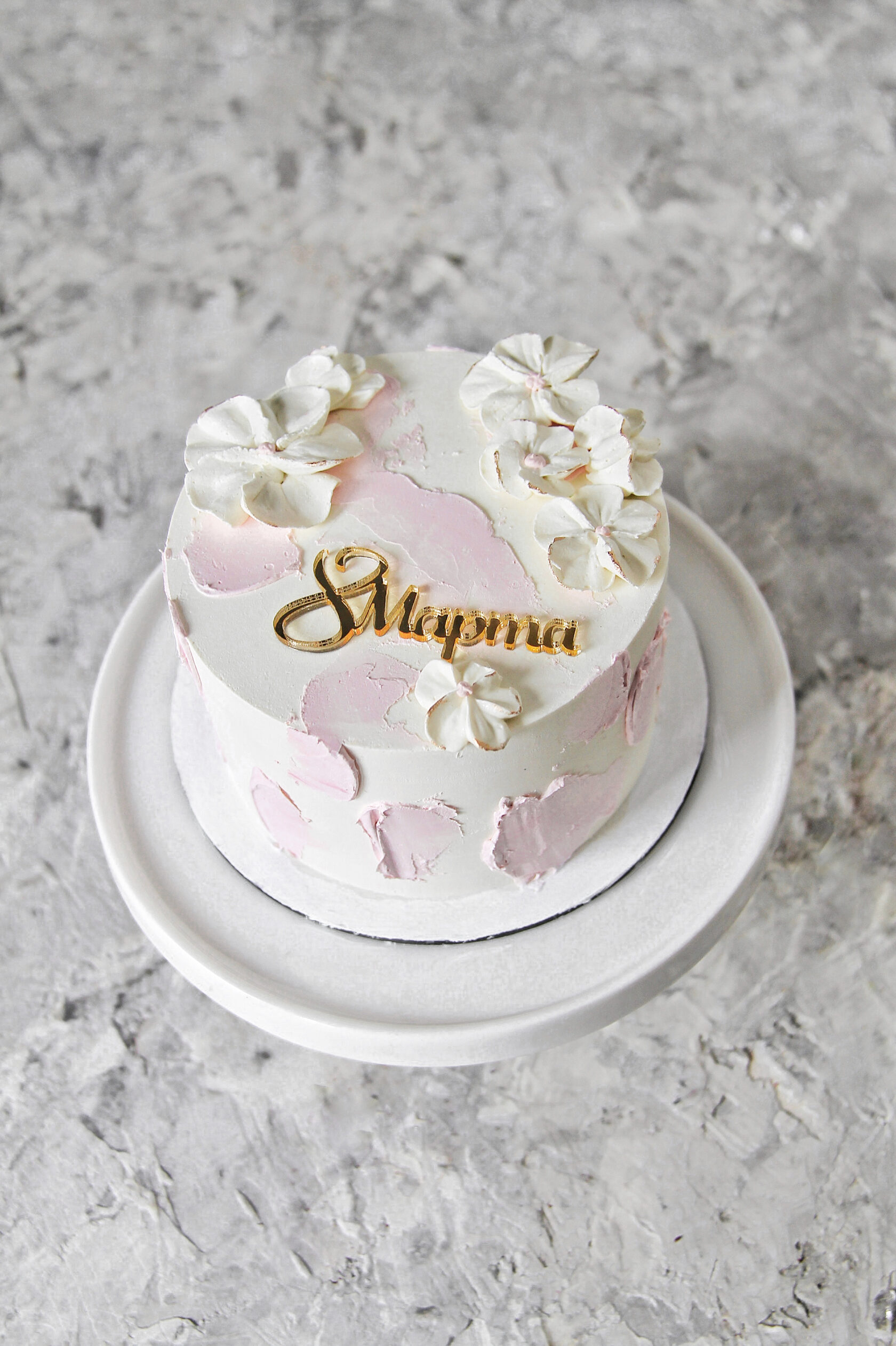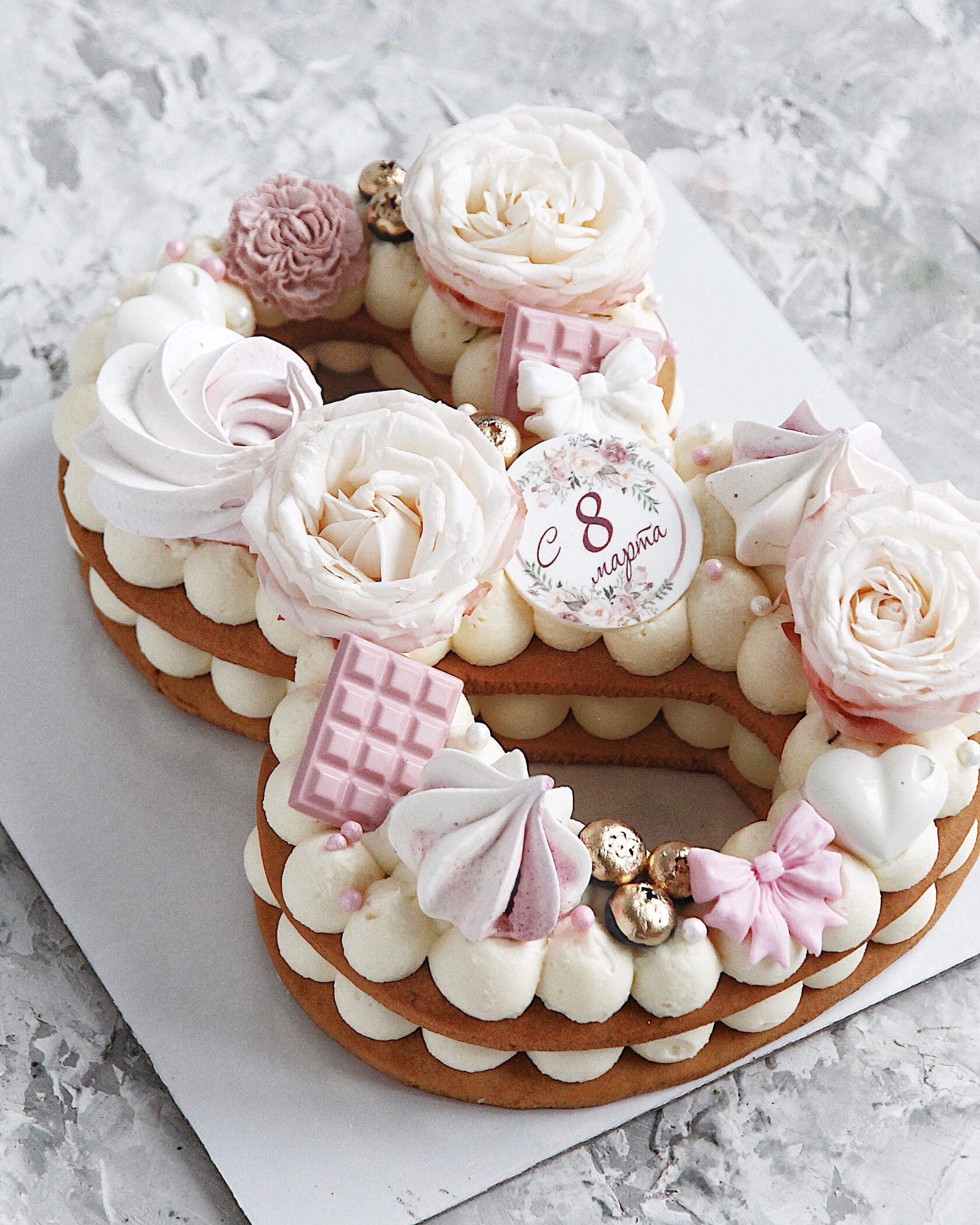 В декоре: живые цветы, безе, шоколадные детали, топпер с поздравлением "8 марта" на сахарной бумаге, голубика