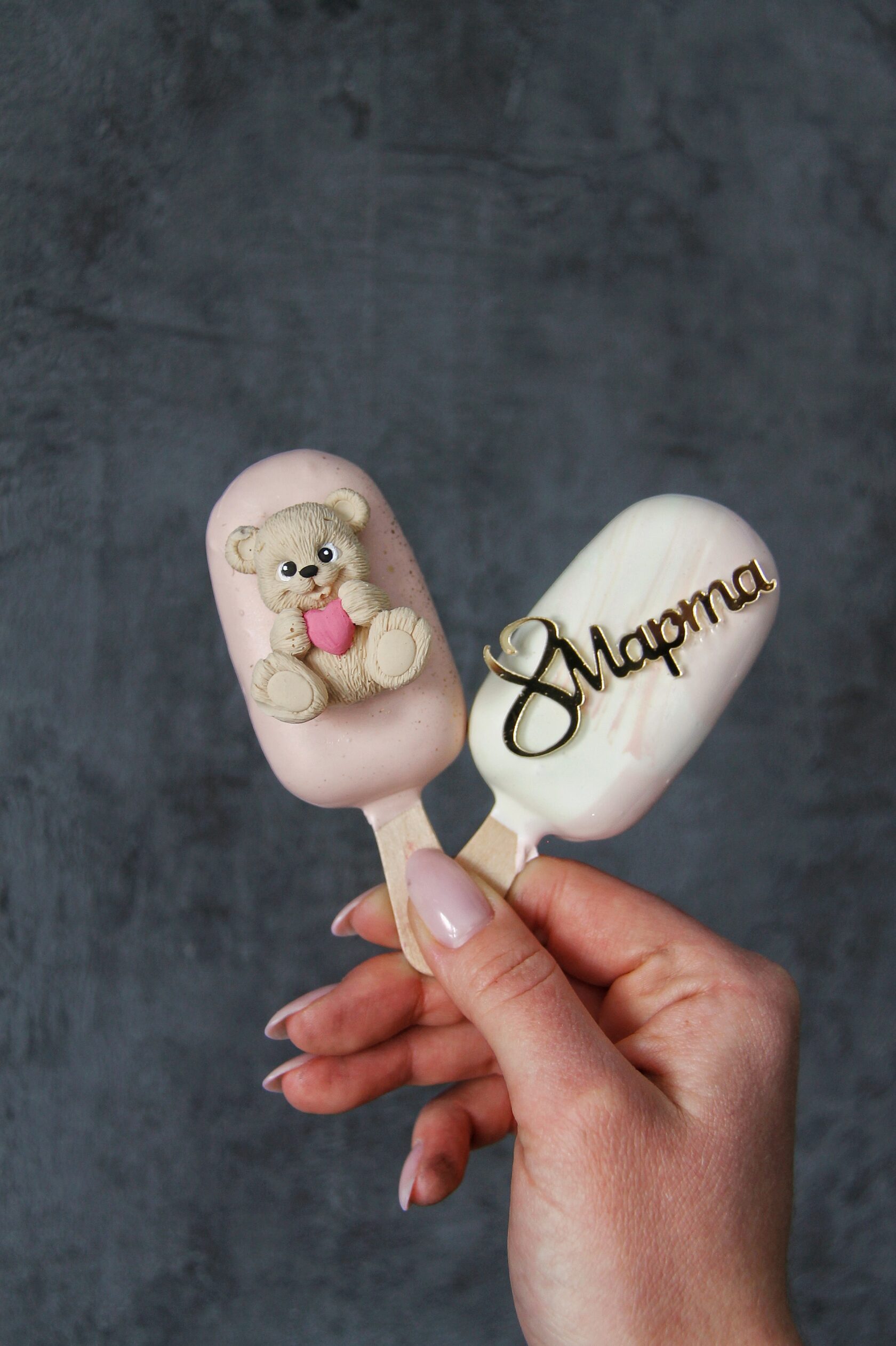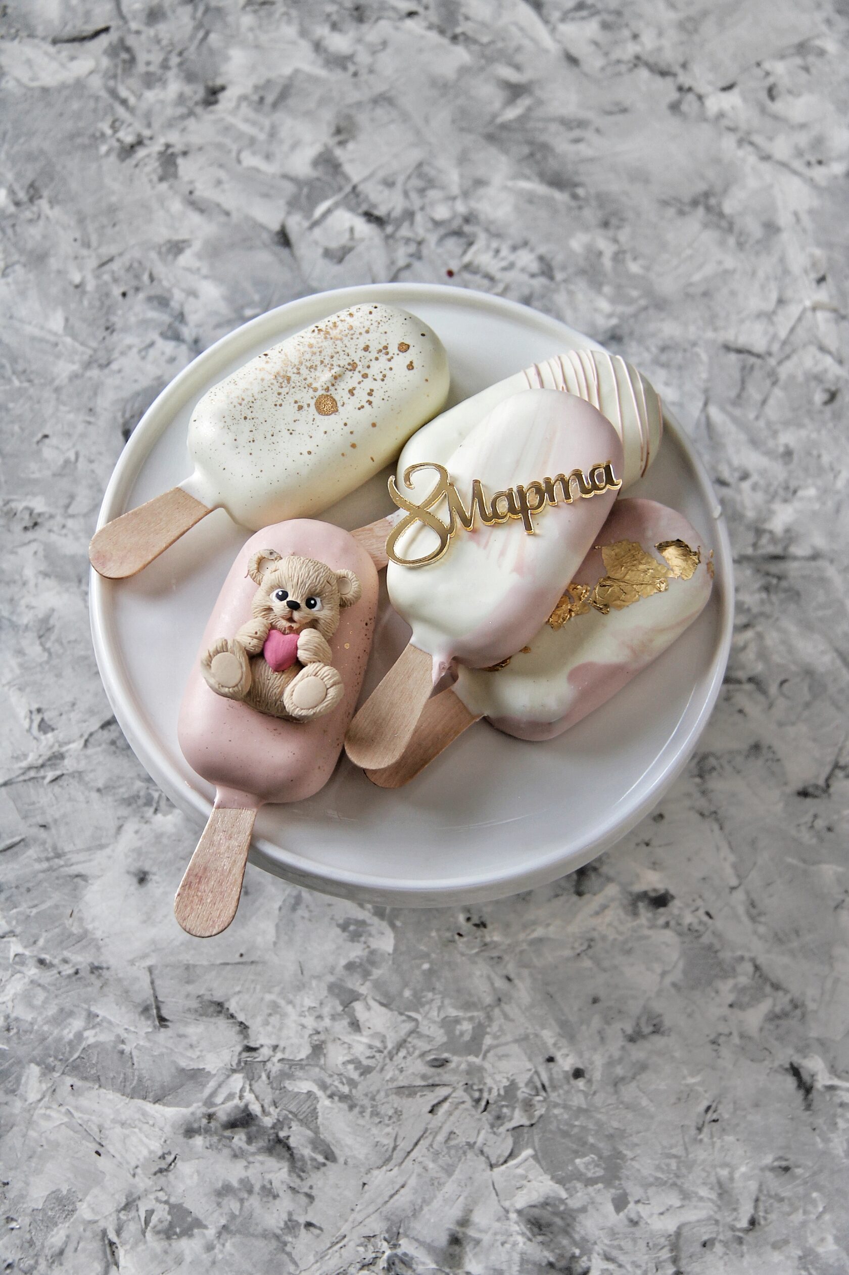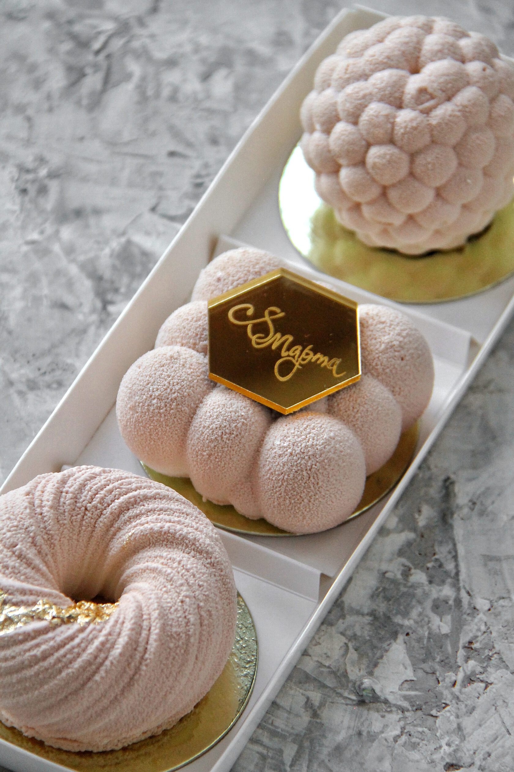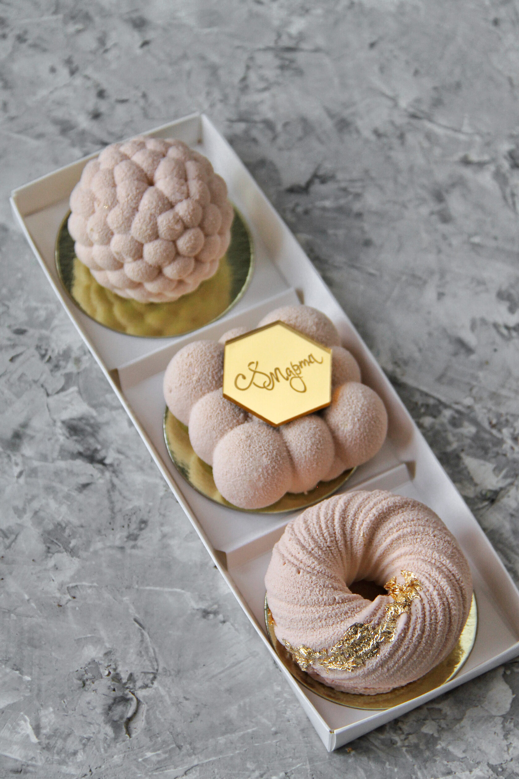 В наборе 3 муссовых пирожных ассорти* с шоколадным декором