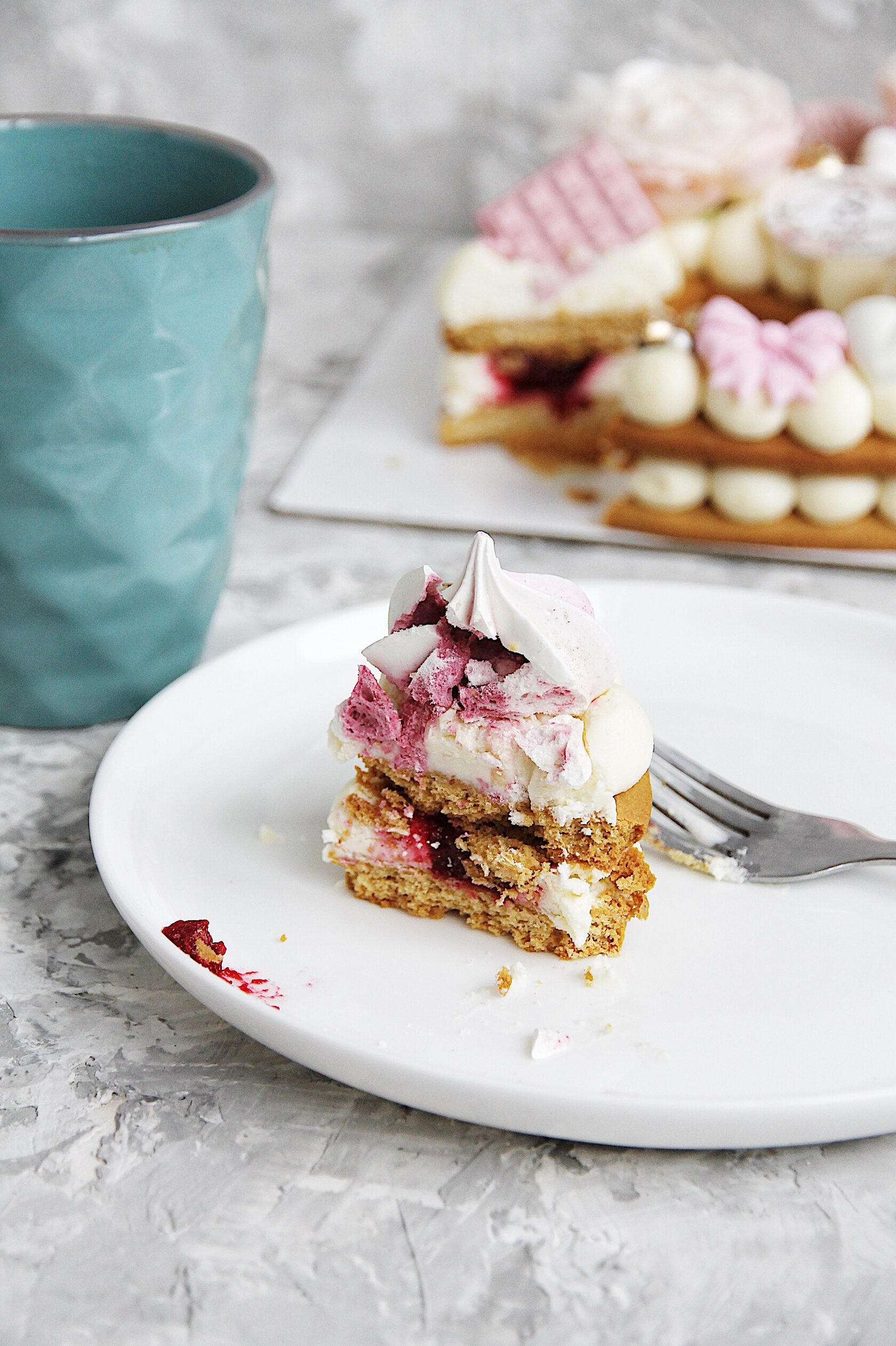 Бисквитное пирожное с начинкой и сливочным кремчизом.