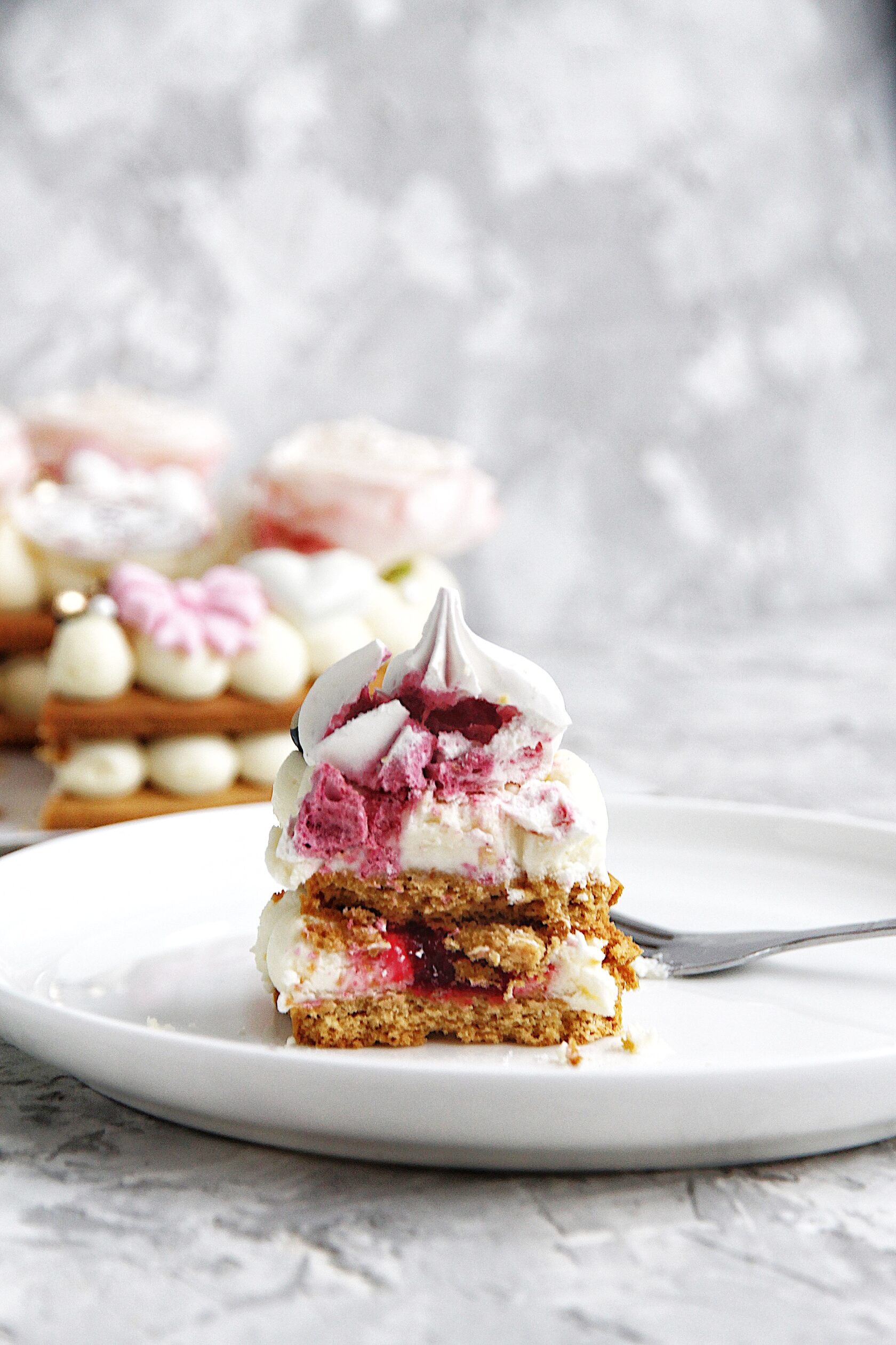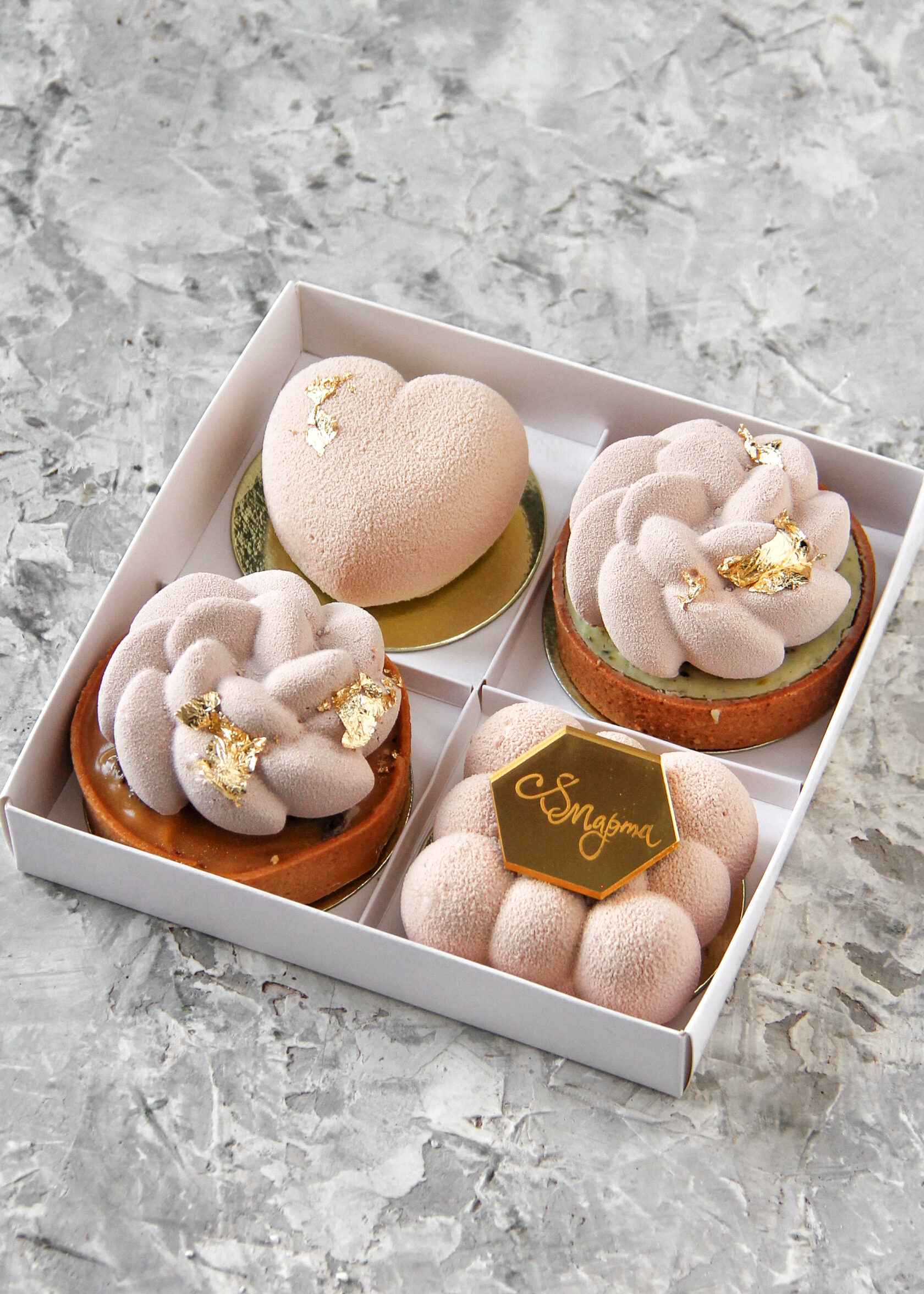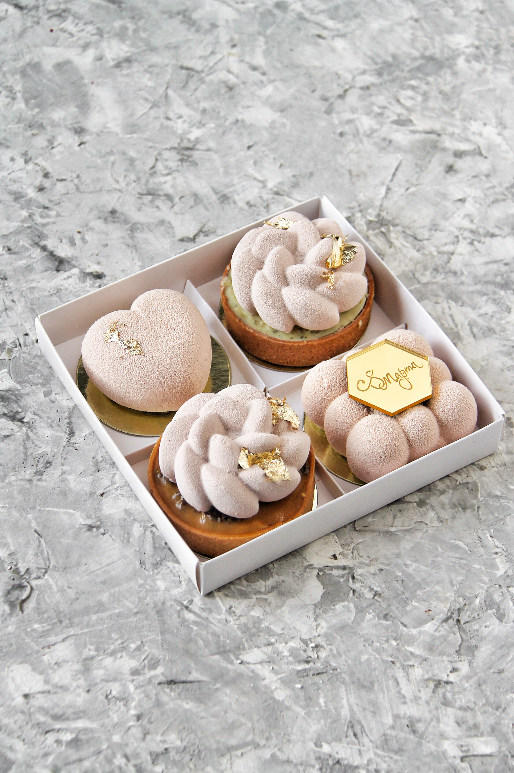 В наборе 4 муссовых пирожных ассорти с праздничным декором и тарталетки с вкусами: • вишня-лайм (Вишневый мусс, вишнёвая начинка с цельной вишней, лаймовый бисквит, ганаш лайм-мята, песочная основа из тонкого французского теста) •Манго-маракуйя (Песочная основа из тонкого французского теста, маракуйевая карамель, крем манго, шапка из нежного маракуйевого мусса)