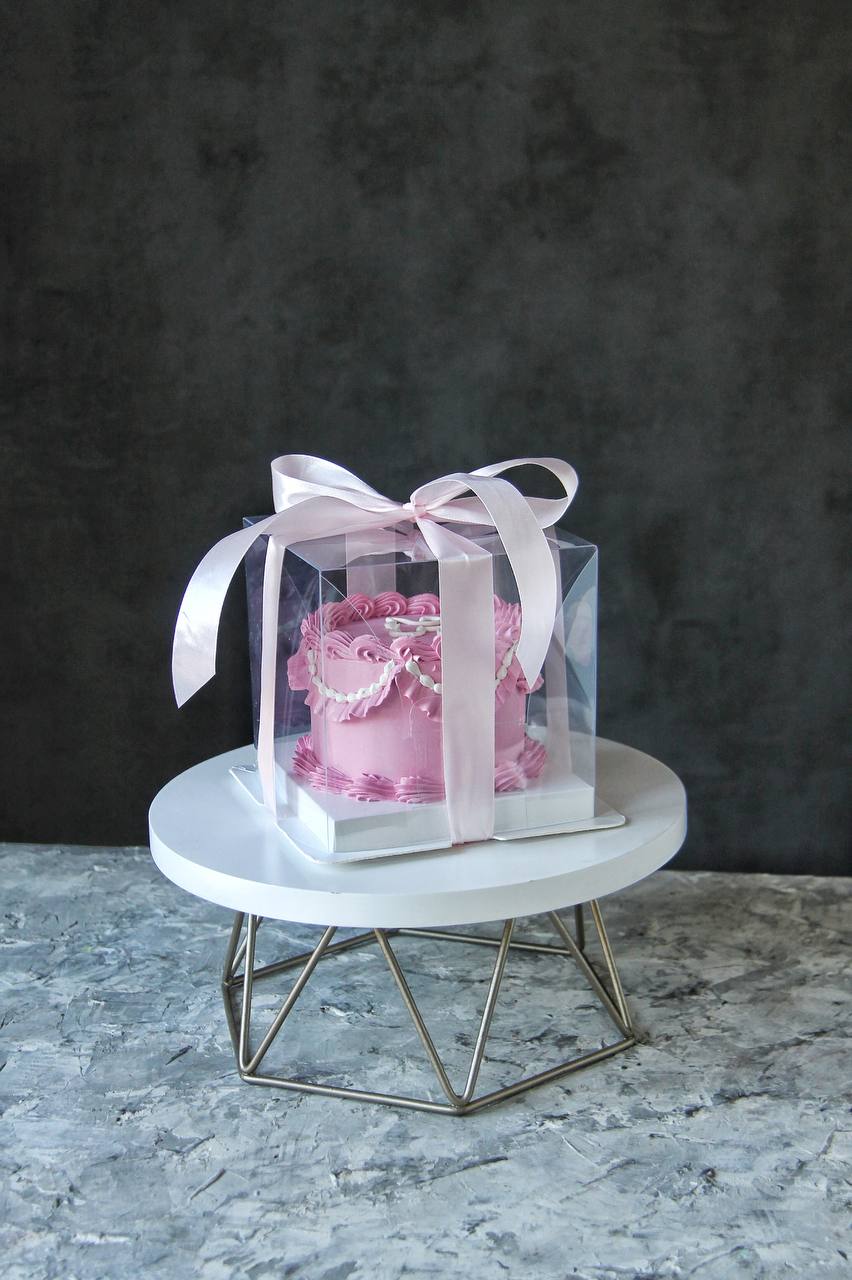Каждый торт упакован в коробку с прозрачной крышкой и атласной лентой