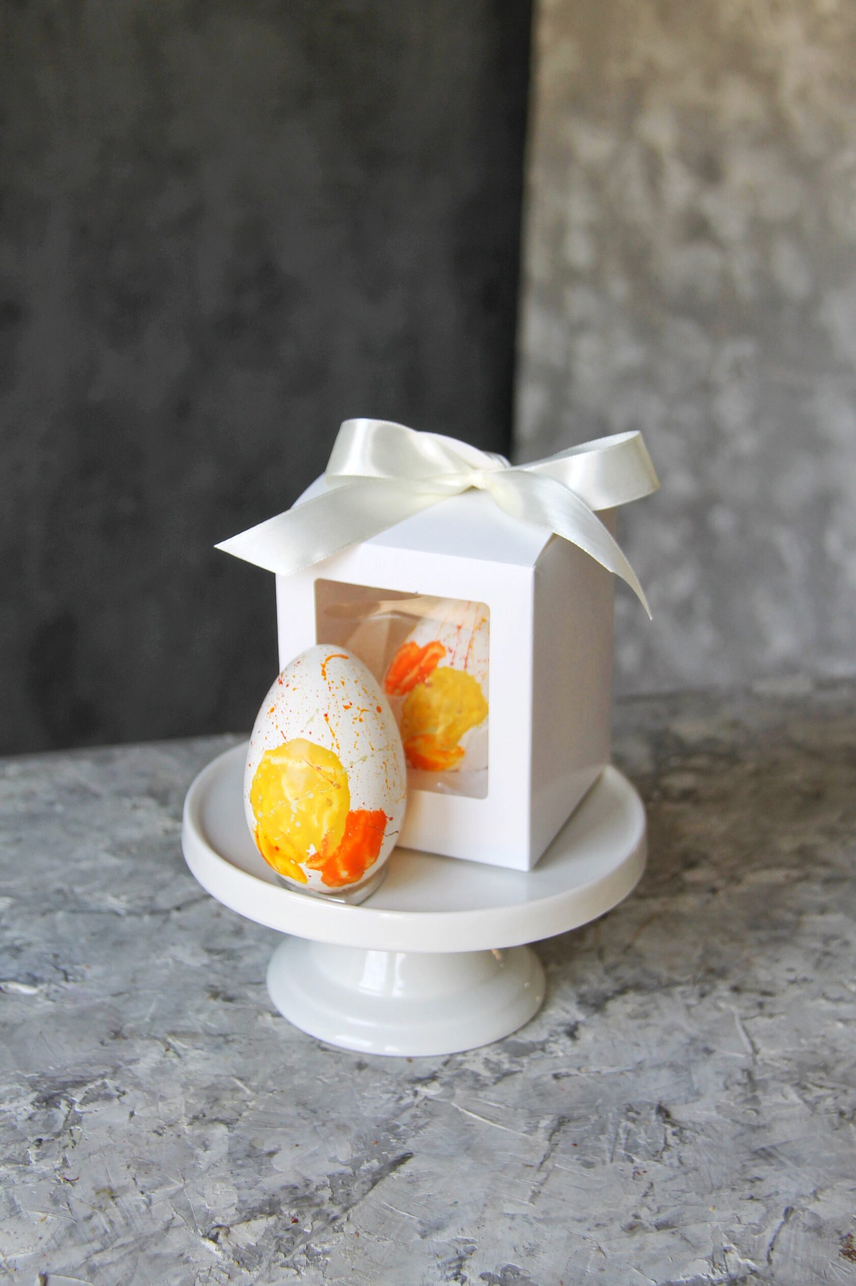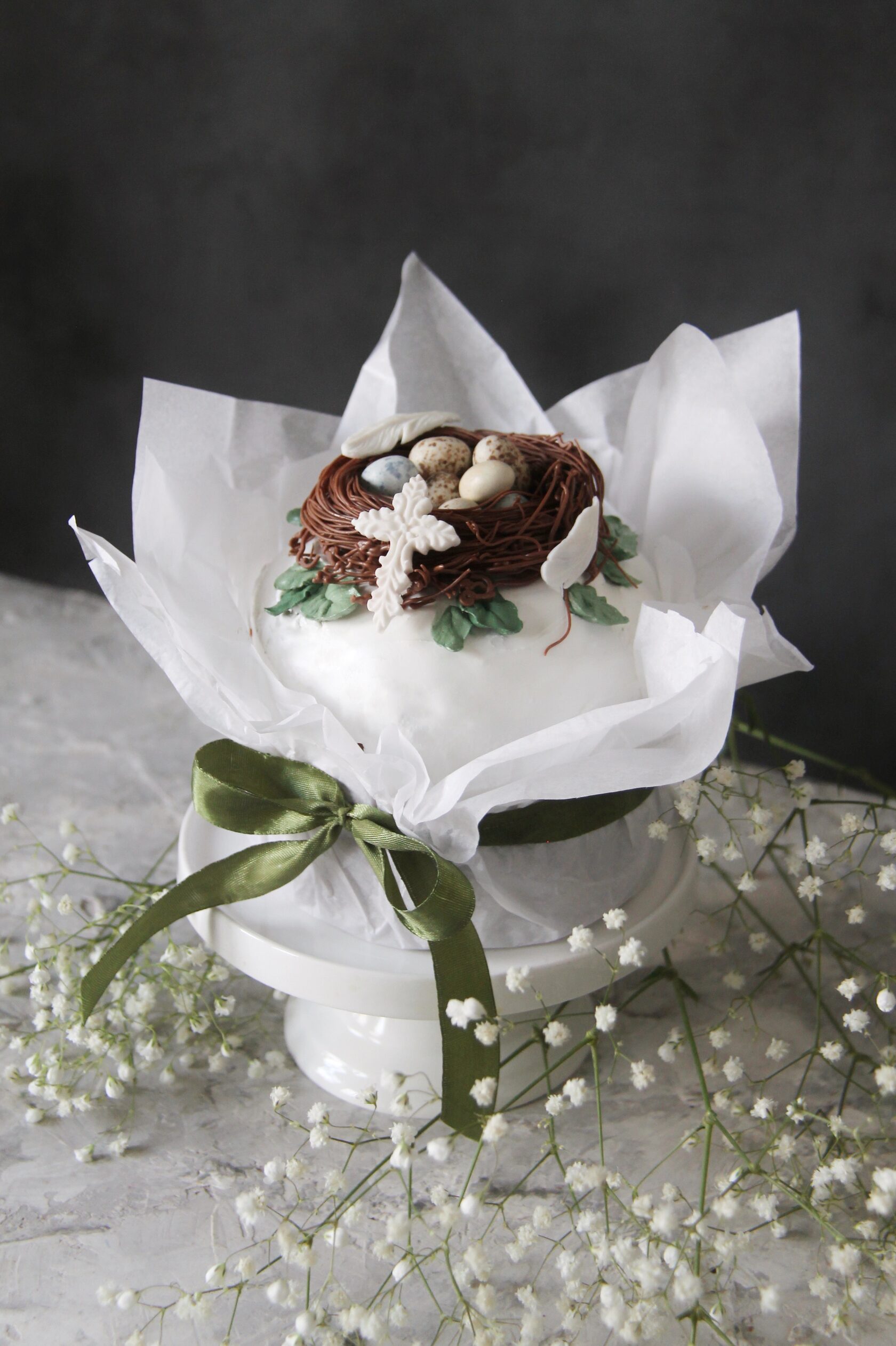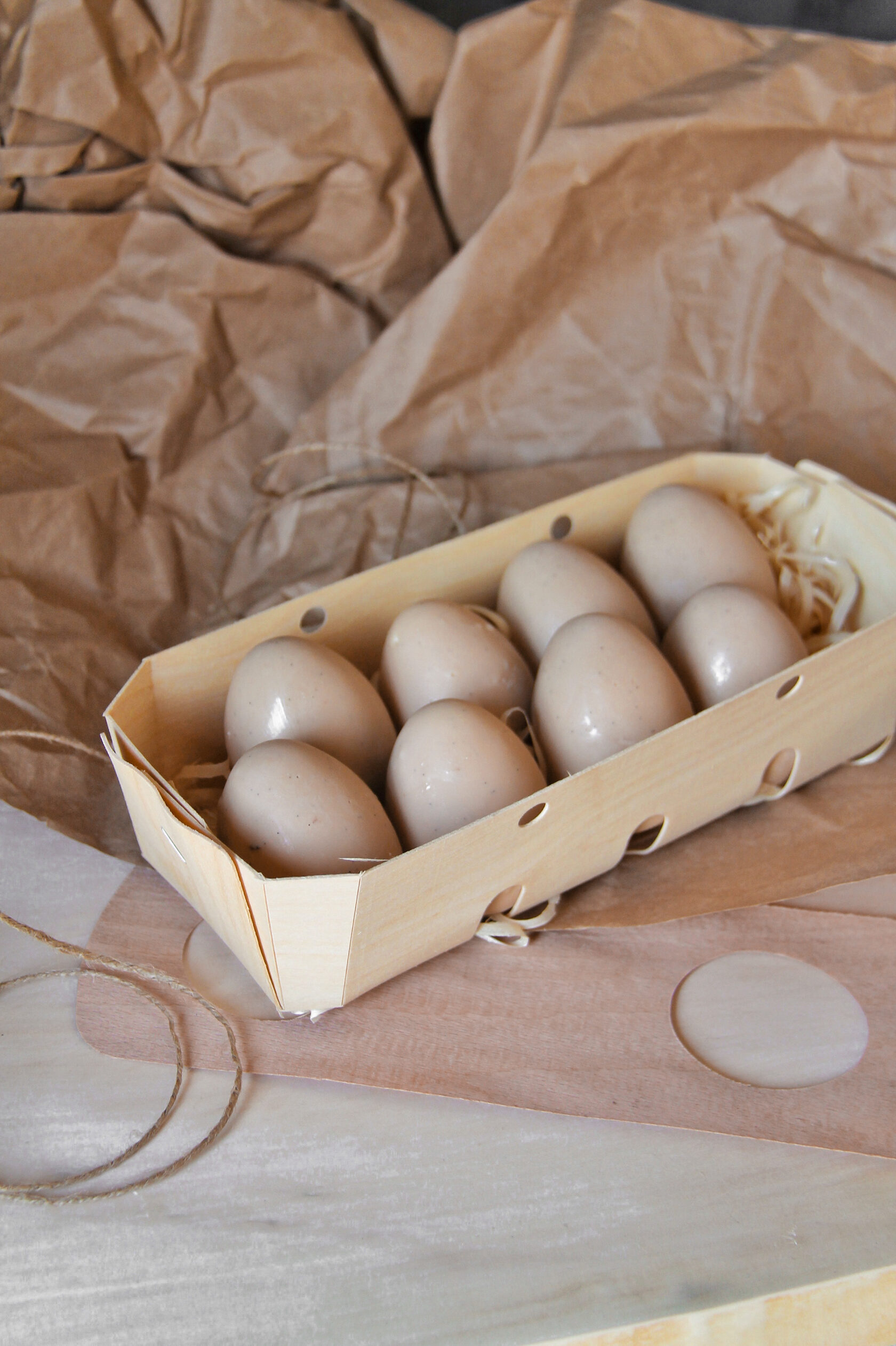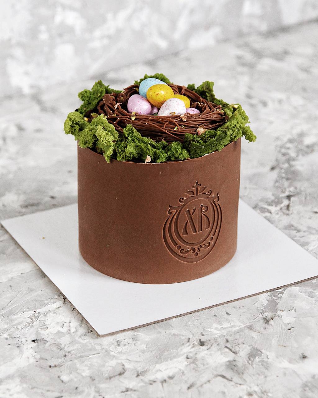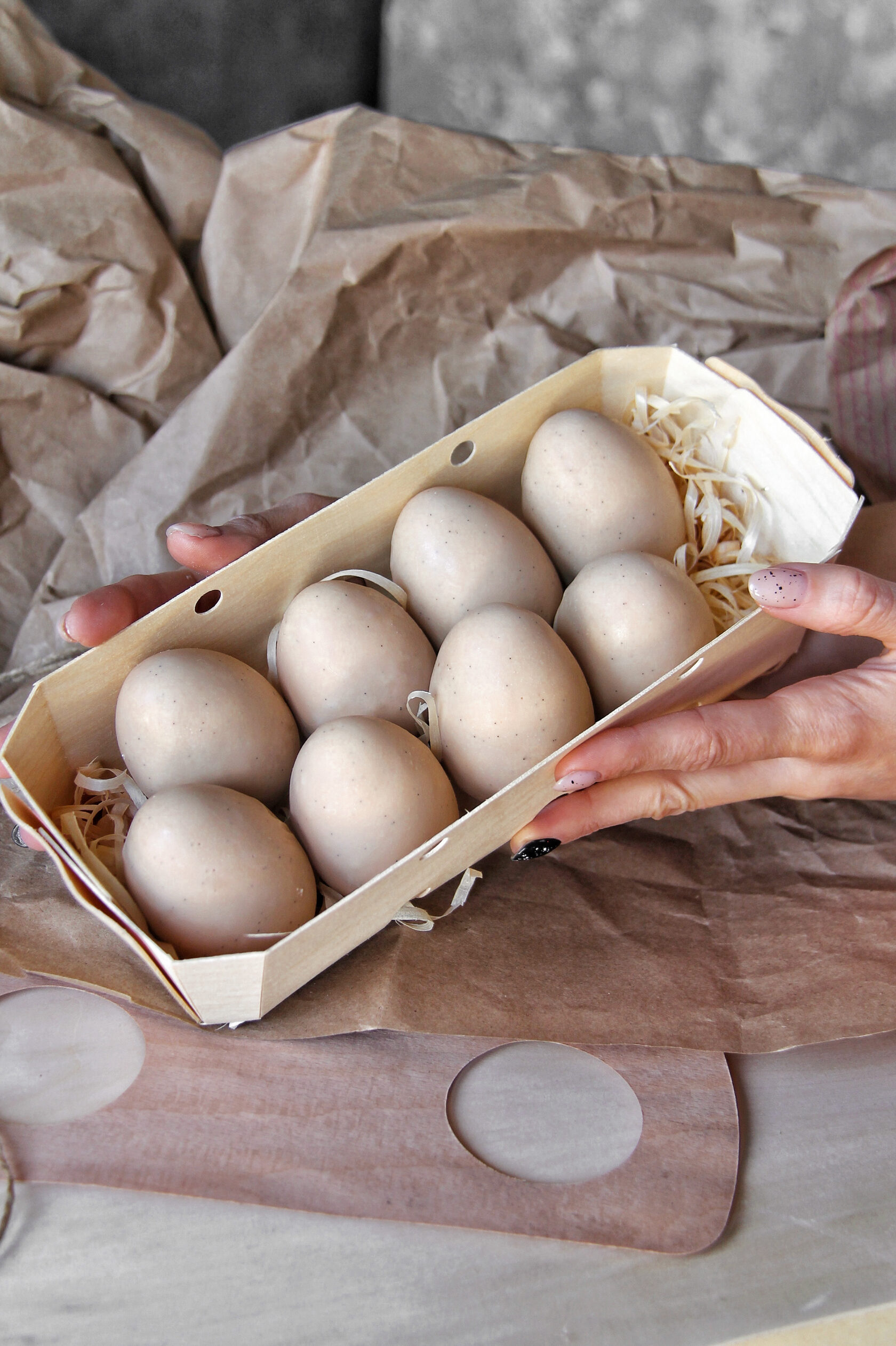 В наборе 8 муссовых пирожных в форме яиц. Скорлупа из белого шоколада.