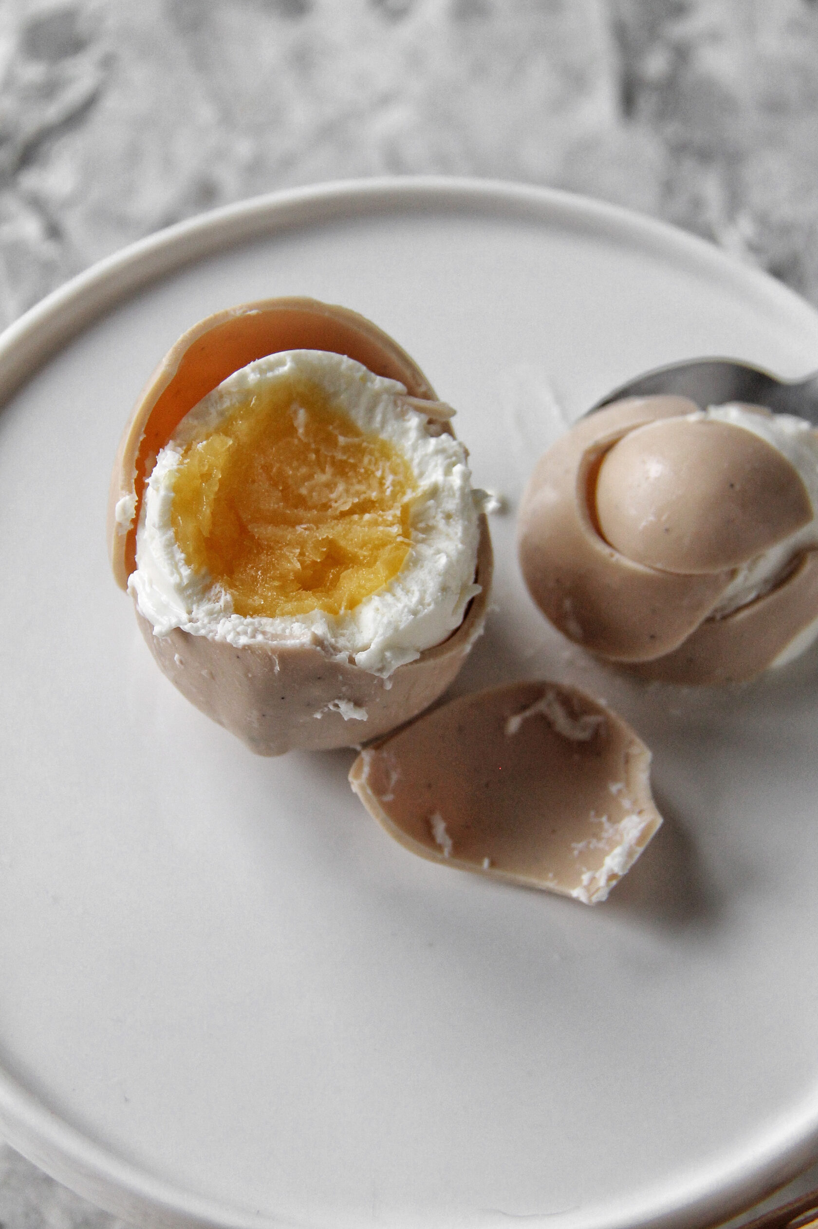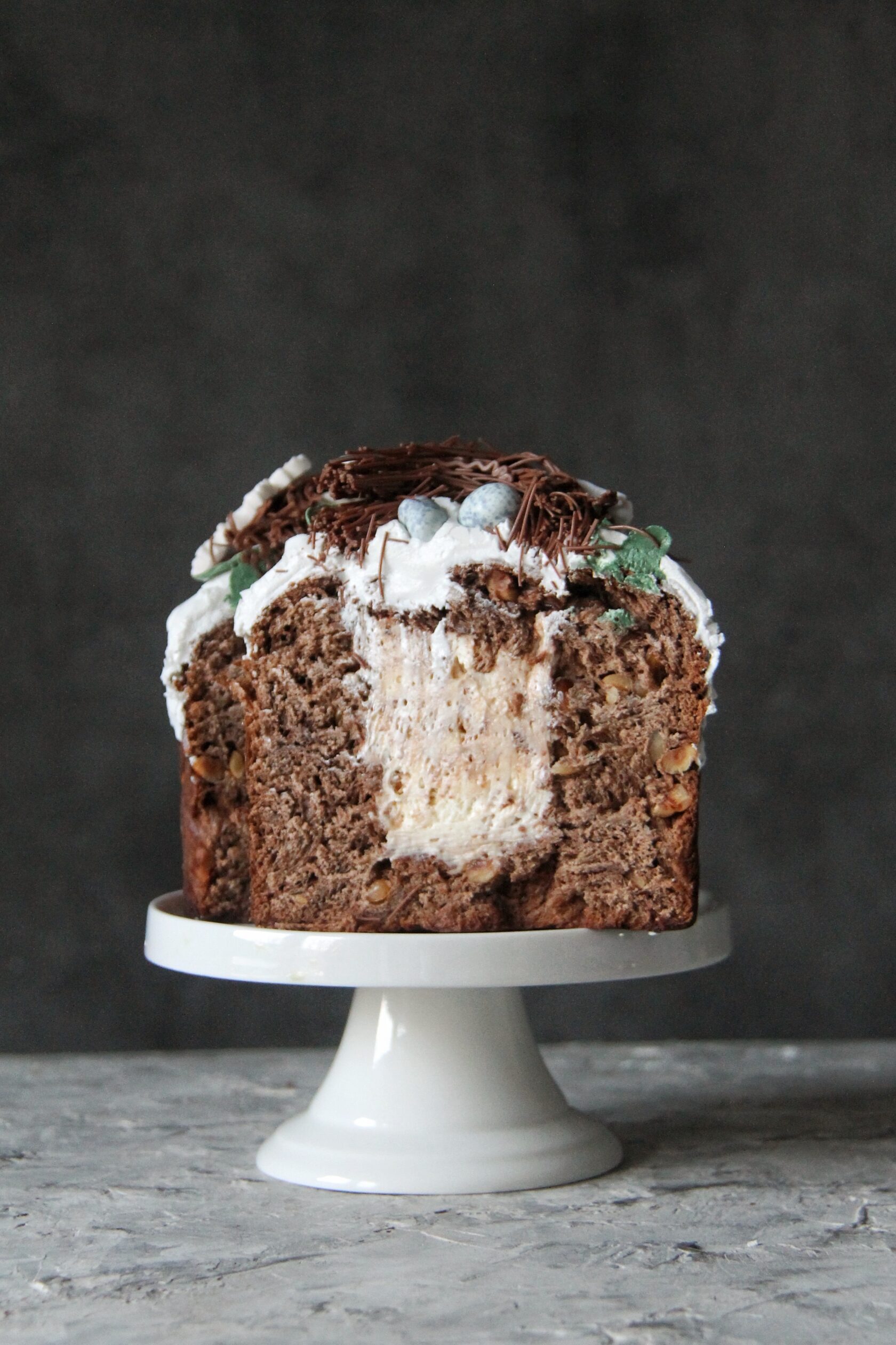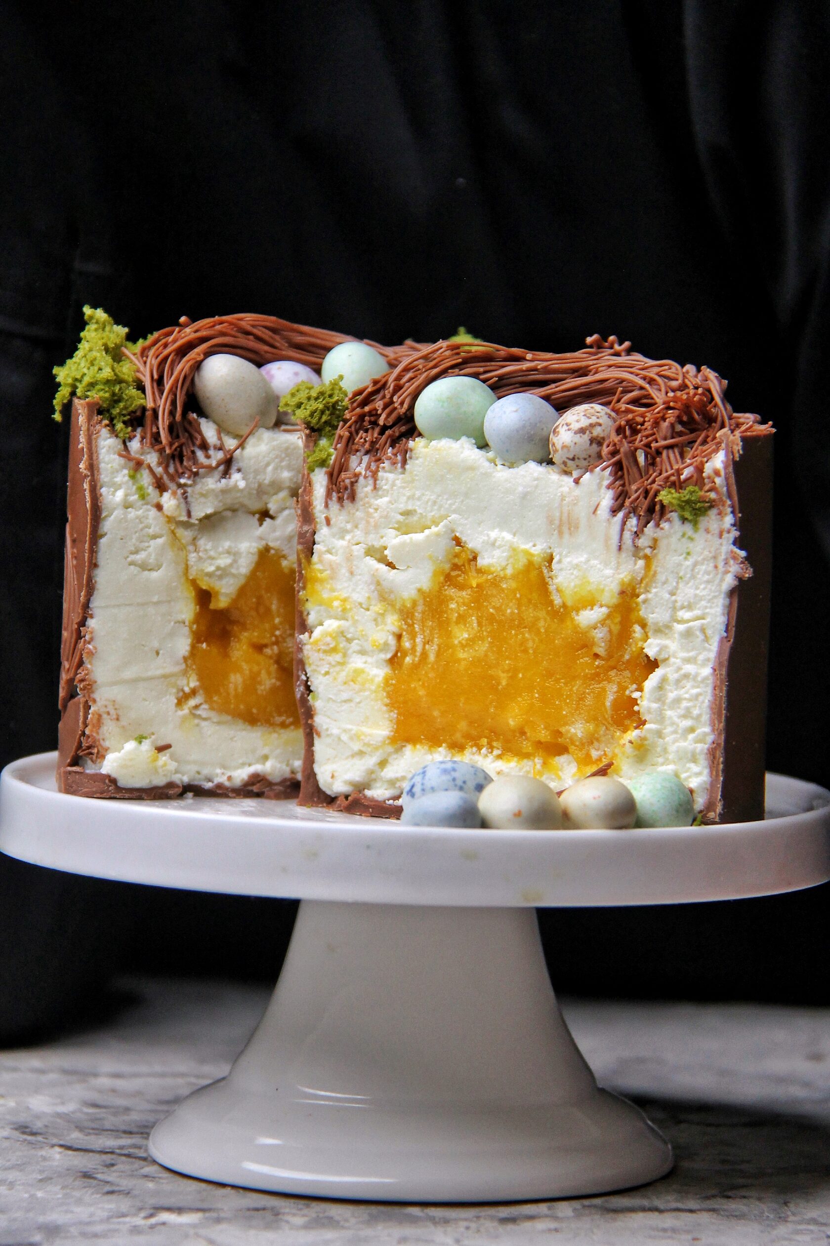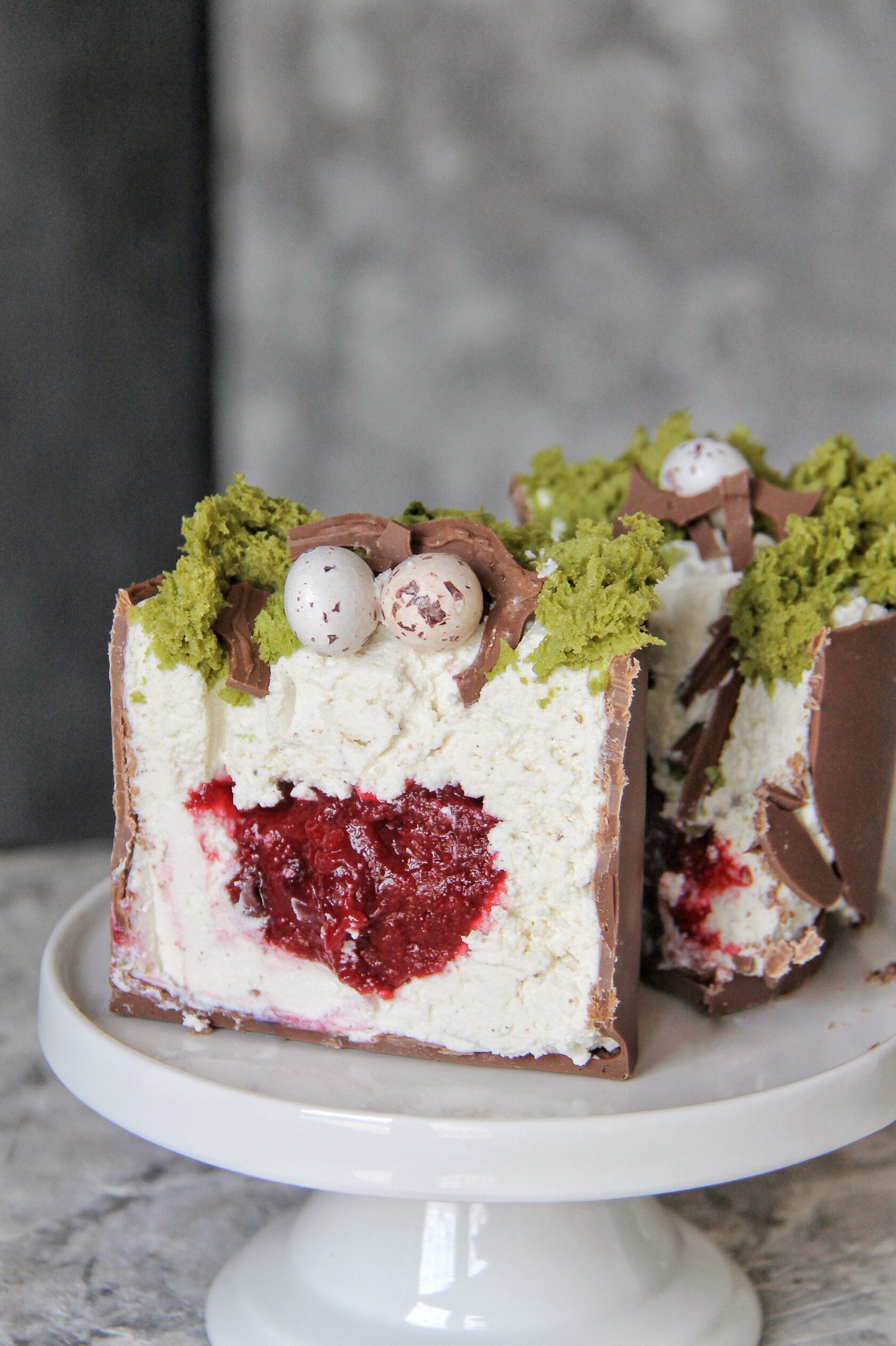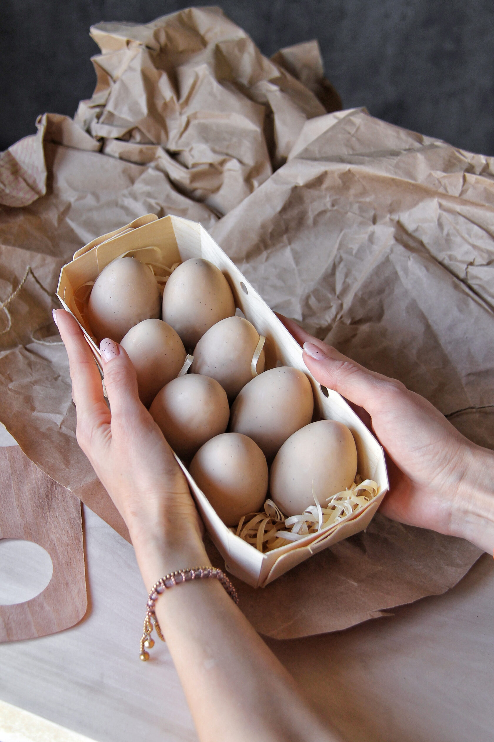 В наборе 8 муссовых пирожных в форме яиц. Скорлупа из белого шоколада.
